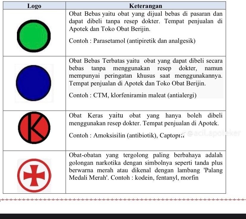- Lingkaran Merah dengan Garis Tepi Hitam dan Huruf K: Ini adalah simbol untuk Obat Keras. Obat ini sangat berbahaya jika tidak digunakan dengan benar dan wajib dibeli dengan resep dokter. Penggunaan tanpa pengawasan bisa menyebabkan efek samping serius atau bahkan keracunan. Contohnya: antibiotik dan obat penenang.